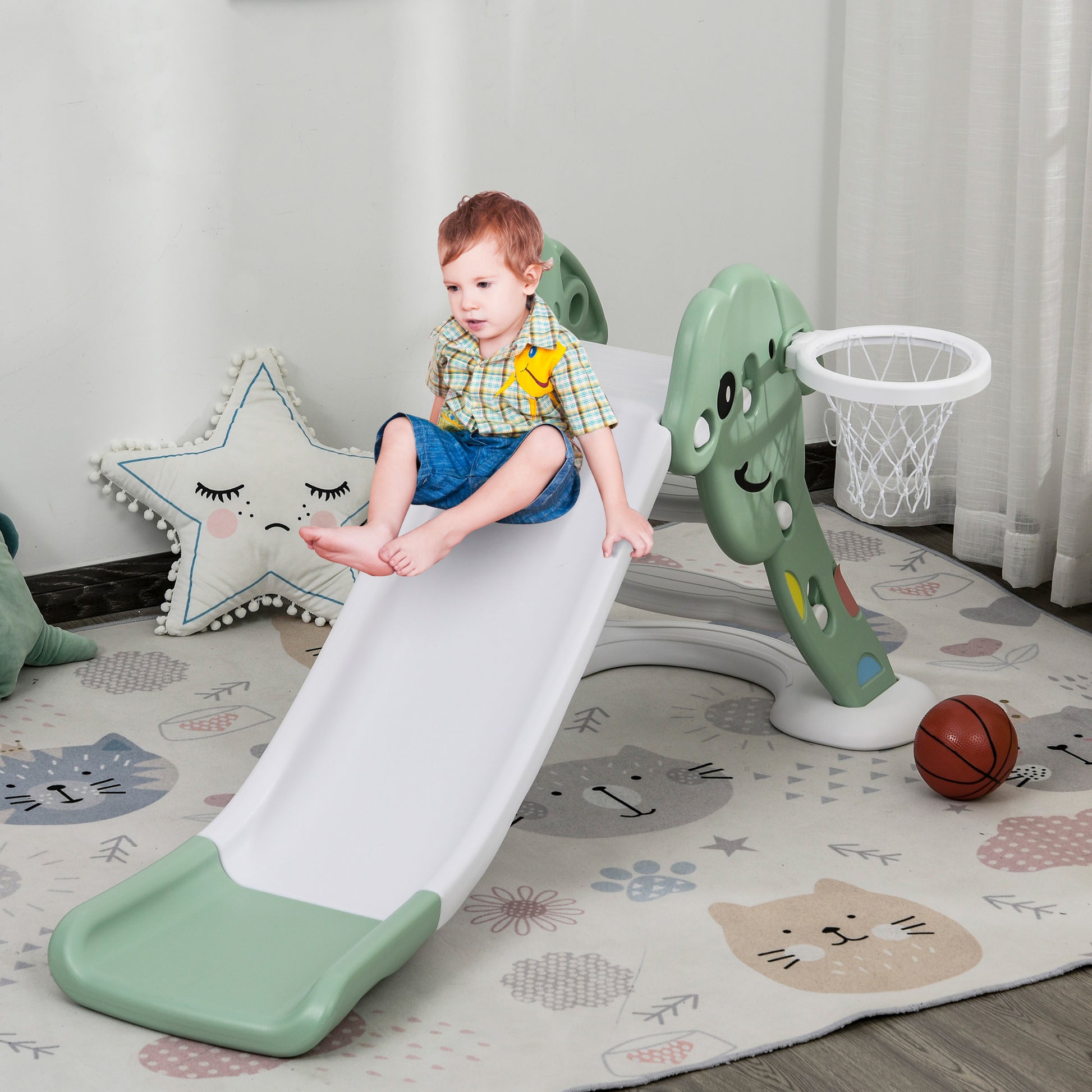 Have fun with your kids with a playset that keeps them active. This kids' slide from Qaba has the right design for your sweeties to smile and have fun. The playset doesn't tip over as kids gleefully slide down because of the longer and wider design. Watch them go back up gleefully as they climb the low-to-the-ground ladder again and again. Features a hoop that gets children introduced and excited about sports. A hoop and slide combo playset provides endless fun for your kids. Features: - Slide is suitable for inside or outside - 2-in-1 function, composed of slide and basketball hoop - Made of environmentally, odorless, HDPE - Smooth sharp edges avoid injuries - Triangle design provides a stable base - Shorter stairwell keeps low speed for sweeties - Extended tail buffer and wide design prevents kids from tipping over the set - No tools required, easy to assemble Specification: - Color: Green, White - Material: HDPE - Overall Dimensions: 57.5" L x 26.75" W x 26.75" H - Basketball Hoop Height: 22" - Certificated age: 1+ years. Recommended age: 18-48 months - Weight Capacity: 55 lbs. - ASTM F963, CPSIA certificated - item label: 331-004GN Package Includes: 1 x Kids Slide 1 x Instruction Manual.